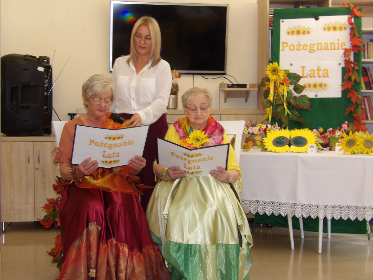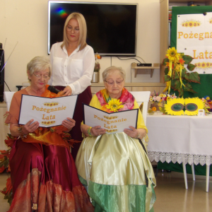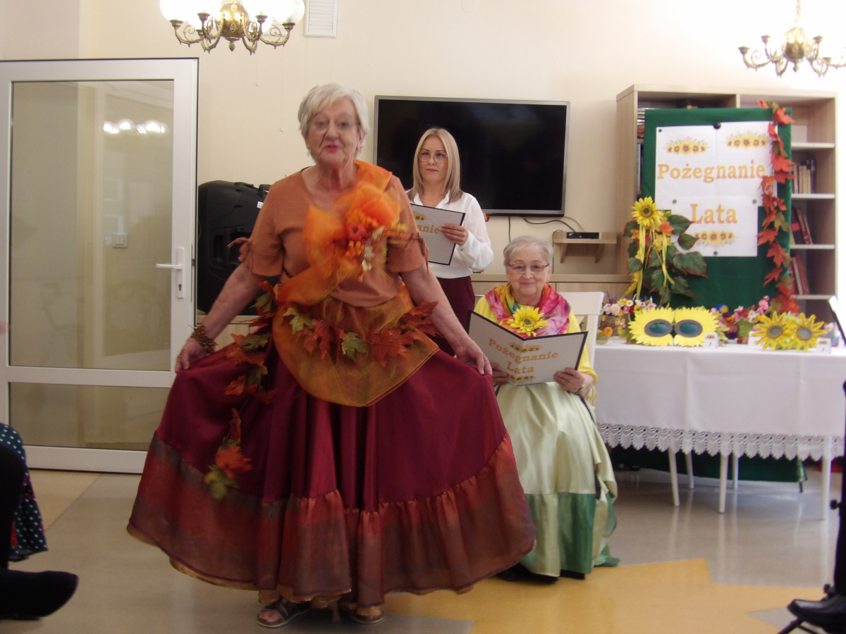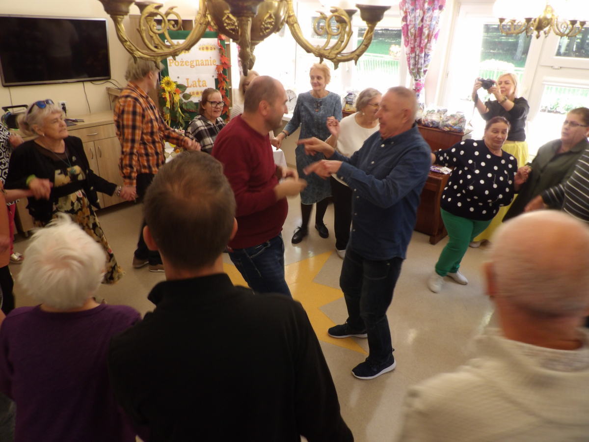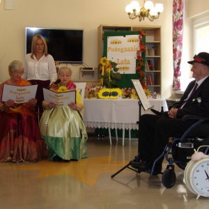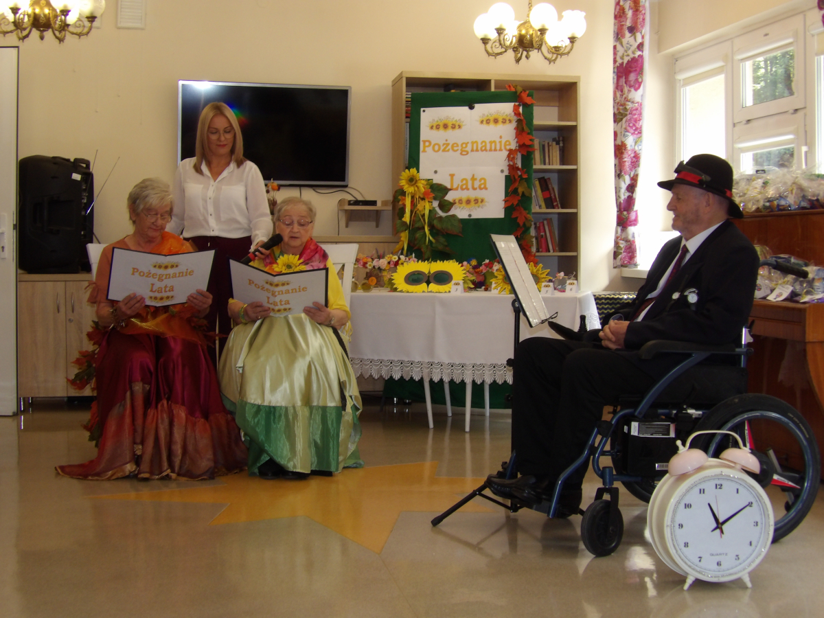 Z okazji pożegnania lata w naszym Domu odbyło się wyjątkowe spotkanie, które zgromadziło Dyrektorów wszystkich Domów Pomocy Społecznej oraz Domu Dziennego Pobytu wraz z mieszkańcami, uczestnikami i opiekunami. Mieszkańcy naszego Domu zaprezentowali dialog dwóch sióstr Lata i Jesieni oraz ich nieodłącznego towarzysza Pana Czasu. Seniorzy wzięli udział w konkursie na najpiękniejsze okulary Pani Lata wykazali się pomysłowością i kreatywnością. Podczas spotkania odbyło się wiele konkursów, które zintegrowały uczestników. Nie zabrakło również wspólnego śpiewu oraz tańca. Dzień minął w radosnej atmosferze.
