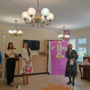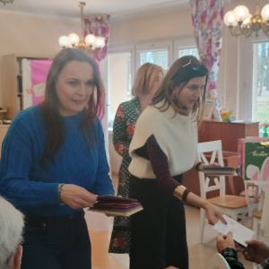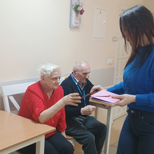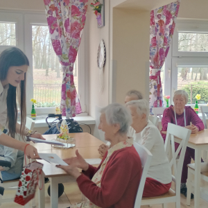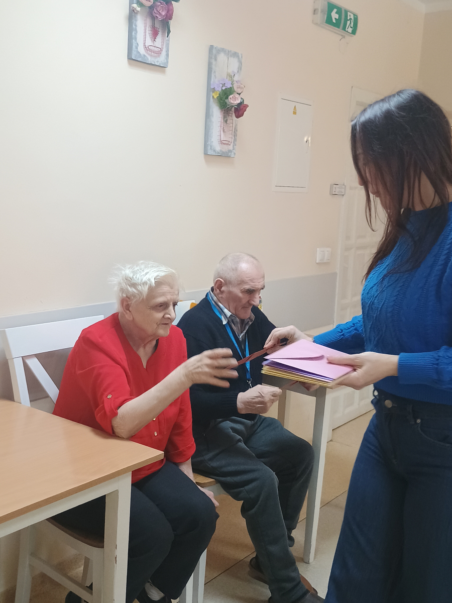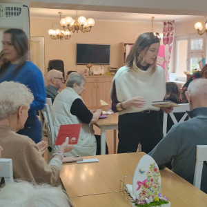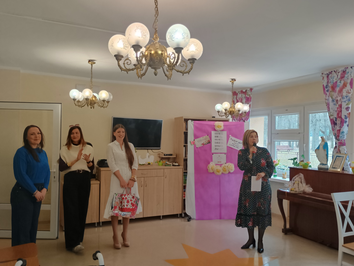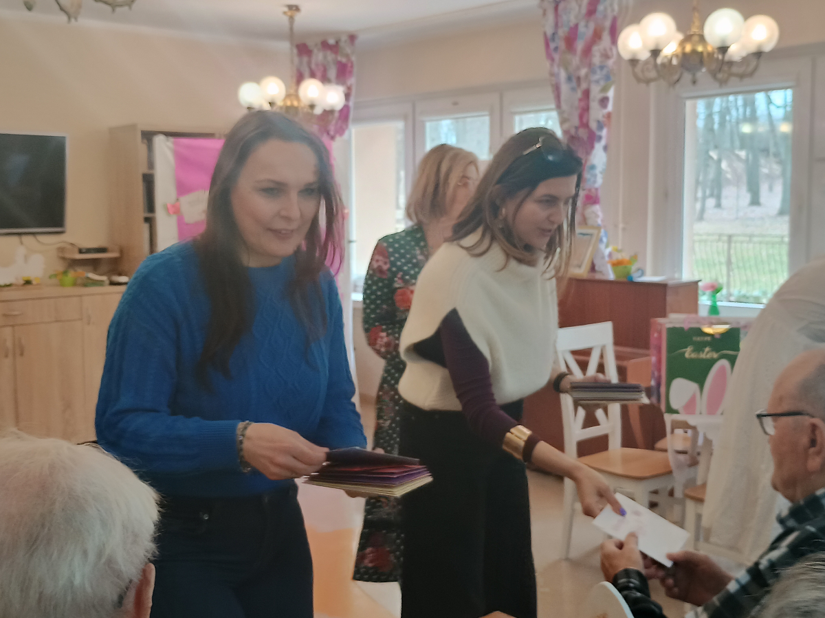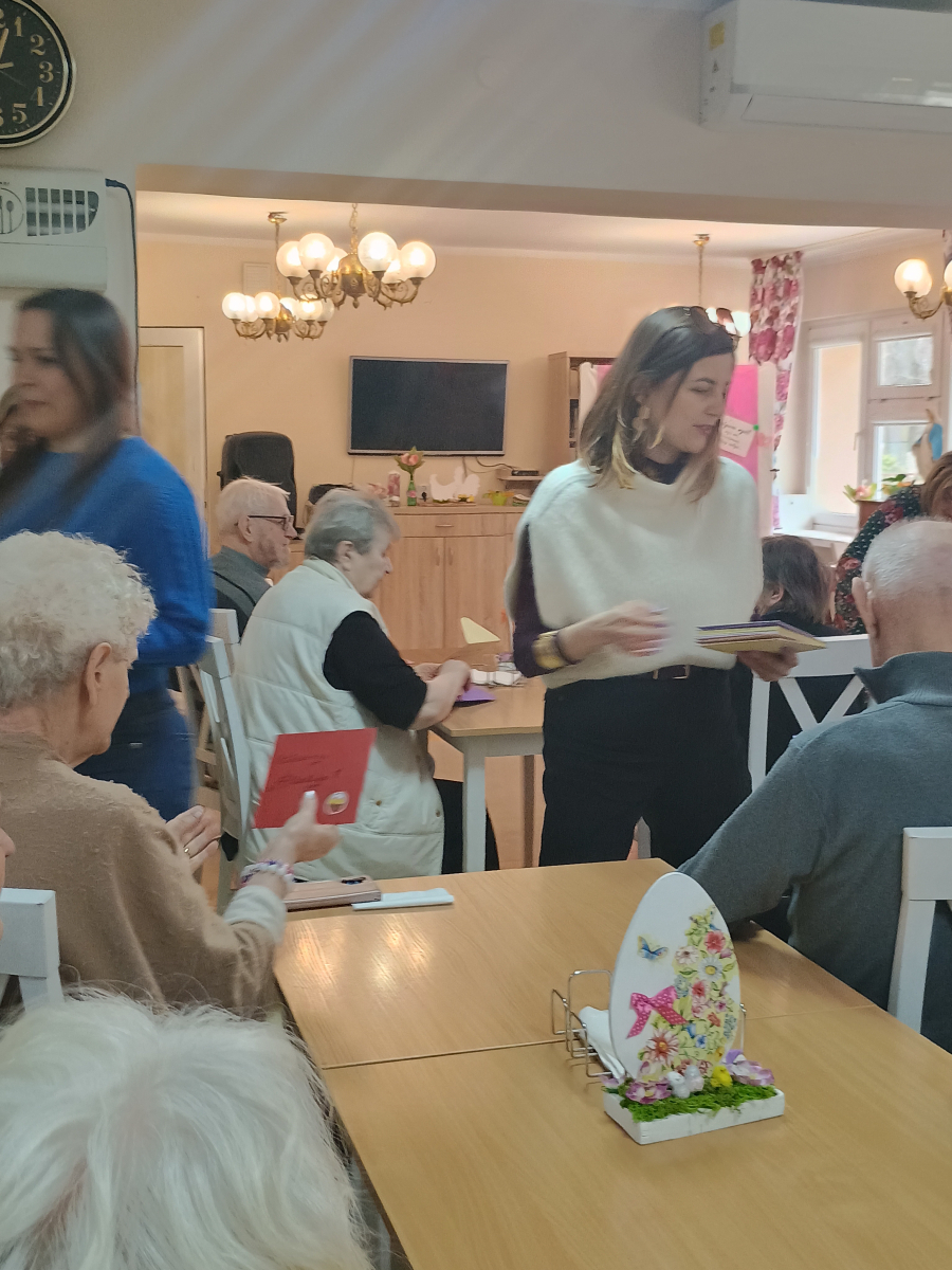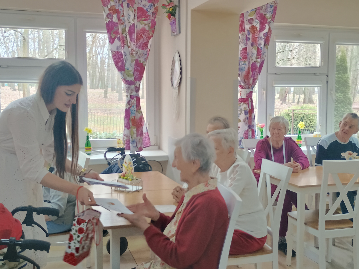 25 marca nasi Seniorzy mieli przyjemność gościć przedstawicielki grupy „Biznes?... jest kobietą!” – Julię Ratajczak, Natalię Leszczyńską oraz Olgę Zamczałę. Panie przygotowały dla Mieszkańców wyjątkową niespodziankę – słodkie upominki oraz własnoręcznie wykonane kartki, które wywołały wiele radości, wzruszeń i serdecznych uśmiechów. Spotkanie przebiegało w niezwykle ciepłej i życzliwej atmosferze, sprzyjającej rozmowom i budowaniu międzypokoleniowej relacji.